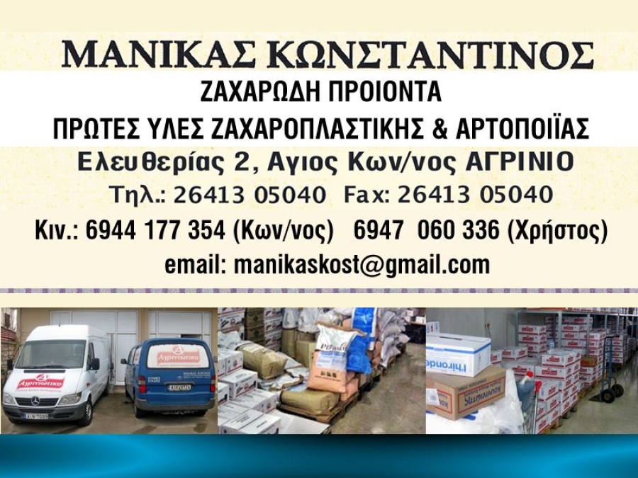 Η επιχείρηση Χονδρικού Εμπορίου και Διανομών του κου Μανίκα Κωνσταντίνου, έχει έδρα στο Αγιο Κωνσταντίνο Αγρινίου και λειτουργεί εδω και είκοσι χρόνια. Τα είδη που εμπορεύεται είναι κυρίως Πρώτες ύλες και Είδη Κουλουροποιείας καθώς και Είδη Ζαχαροπλαστικής, Ζαχαρώδη και Λοιπά Συναφή Προϊόντα.